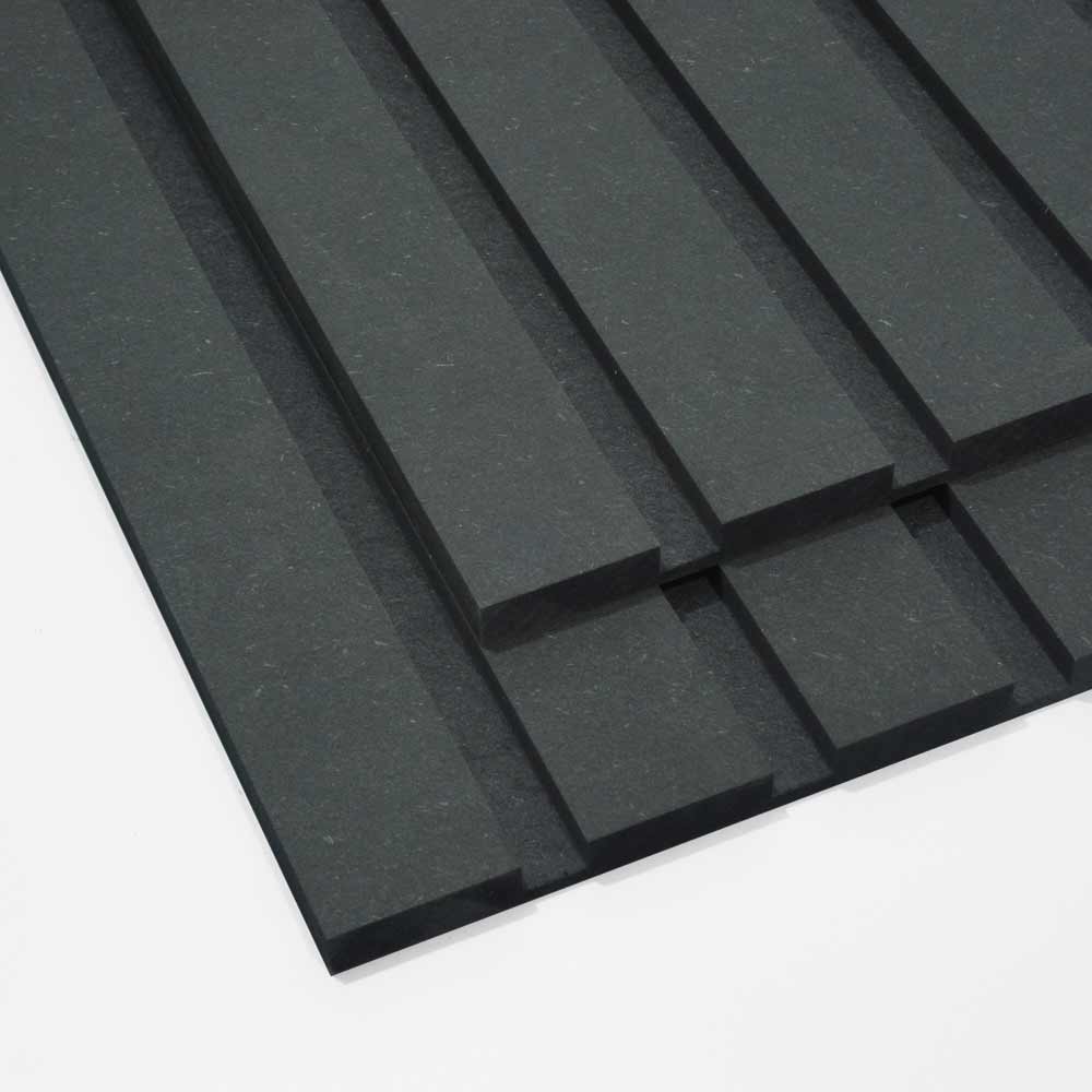 Fluted black MDF is a striking option for contemporary spaces. Pigmented through the core, it allows for seamless edges without the need for painting, providing a deep, consistent tone and modern visual contrast.